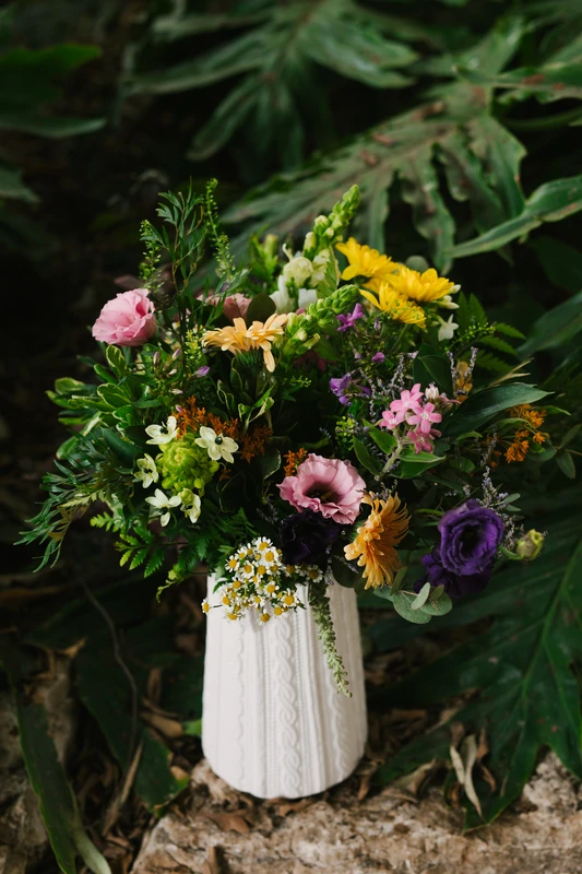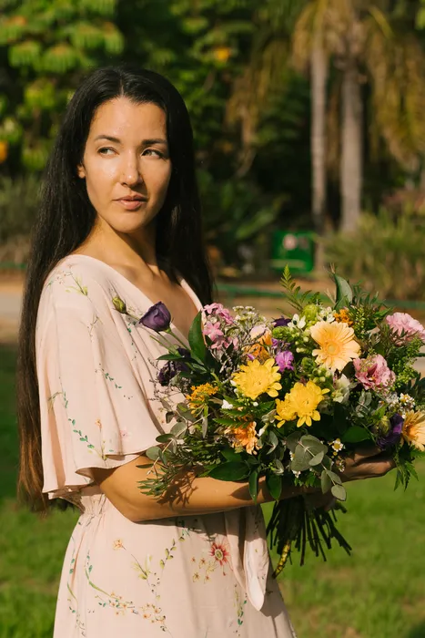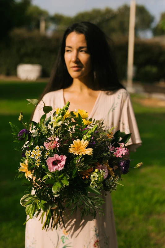 - הרכב זני הפרחים משתנה לפי זמינות אך שומר על אותה פלטת צבעים והרמוניה כללית