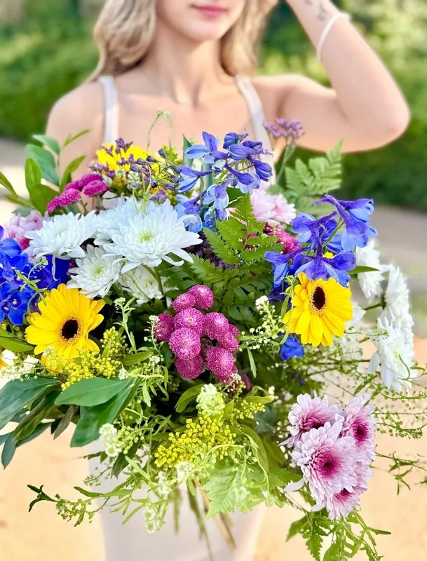 זר פרחים פייה טיאנה Tiana הוא יותר מזר – הוא חוויה חיה של טבע פורח ועושר רגשי. מדובר בזר שובה לב שמורכב ממבחר רחב של פרחי עונה רעננים בגוונים עליזים ועמוקים: חרציות לבנות וורודות עם מרכז בורדו עדין, גרברות צהובות שמשדרות אור וחום, לוע הארי סגולים וכחולים שמוסיפים תחושת עומק ואצילות לכל תצוגה. התוצאה היא קומפוזיציה עשירה ומלאת חיים שמדברת בשפה של טבעיות אמיתית.
